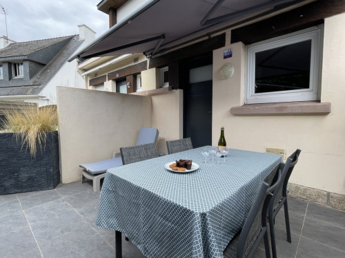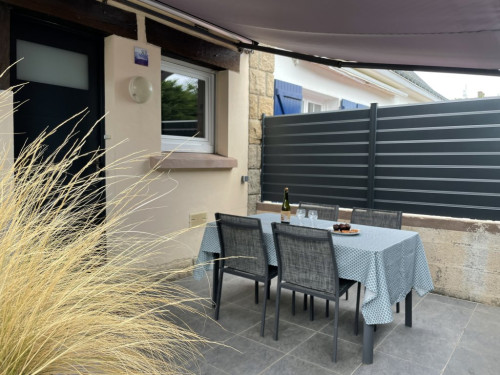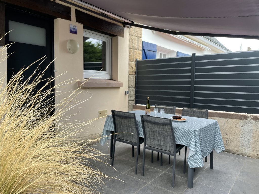 Jardinet et cour privative, terrasse avec store banne électrique et salon de jardin, plancha électrique.