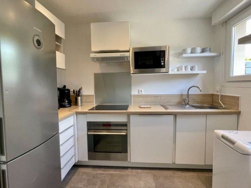- cuisine équipée : cafetière, grille-pain, bouilloire, réfrigérateur-congélateur, lave-vaisselle, four, lave-linge, micro-ondes, table et fer à repasser, enceinte connectée