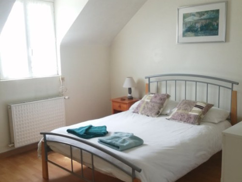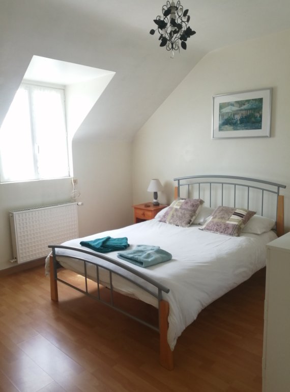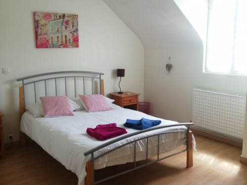 L'escalier vous amènera sur une grande chambre spacieuse et mansardée avec 1 lit double, d'environ 40 m² et sa salle de bain privative avec WC.