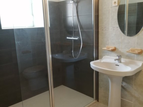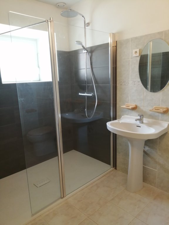 Au RDC une salle de bains avec un WC et un couloir pour sortir sur la terrasse arrière et le jardin commun aux deux gîtes.