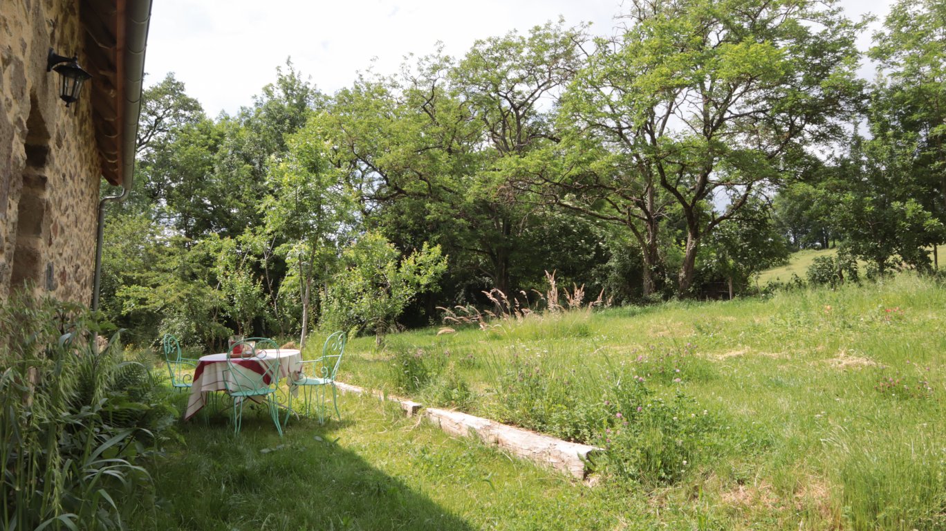 Extérieur : jardin privatif avec une terrasse ensoleillée & une terrasse "au frais", salon de jardin et barbecue