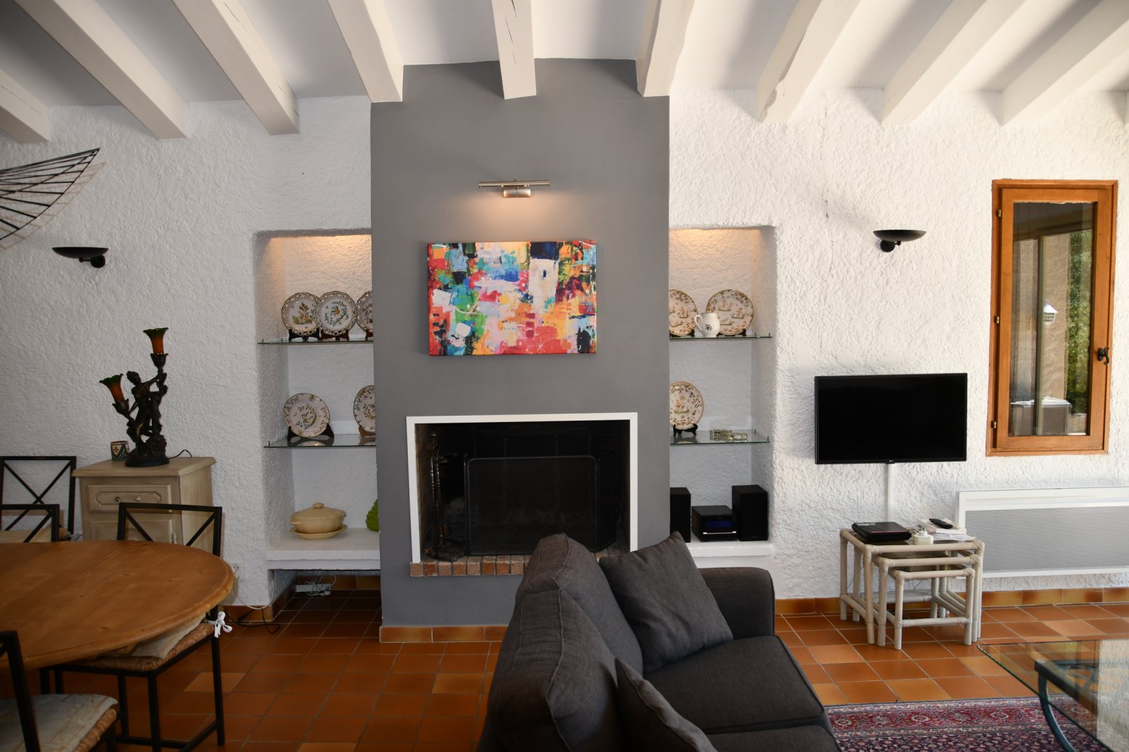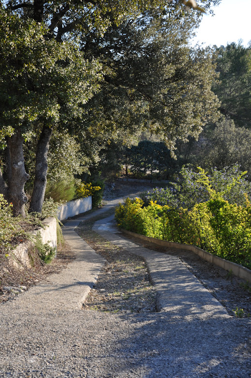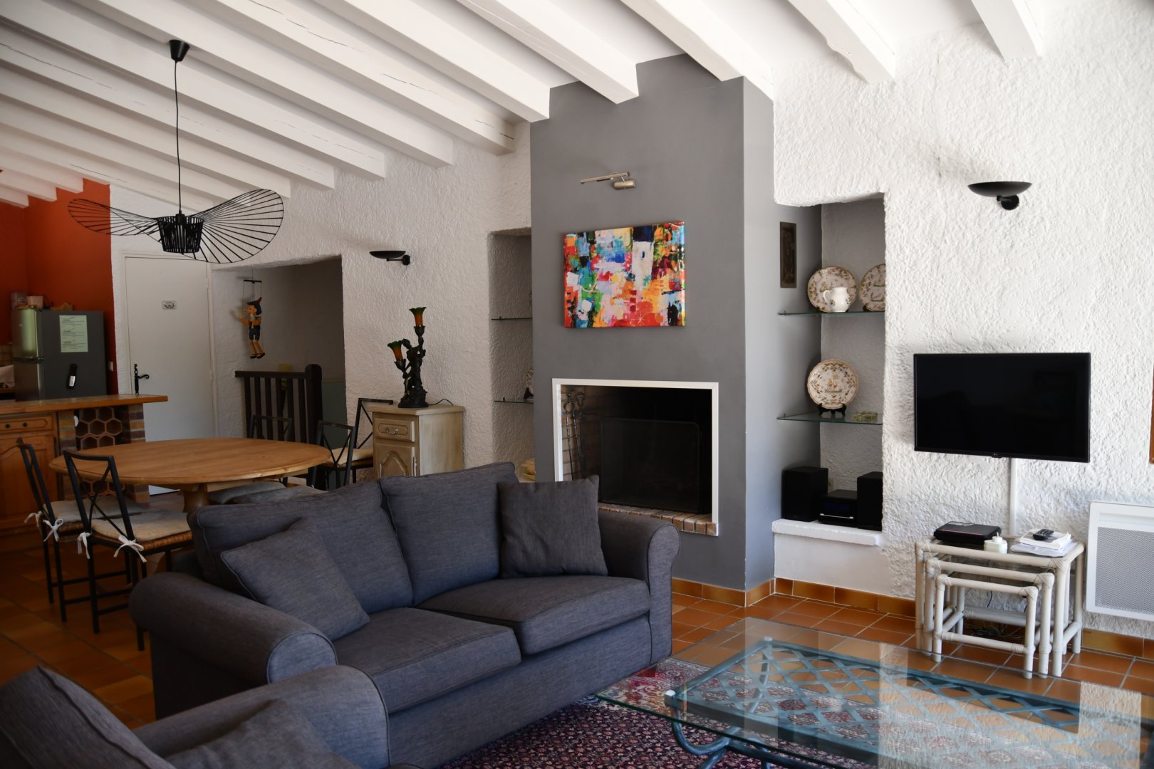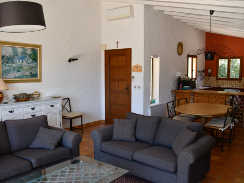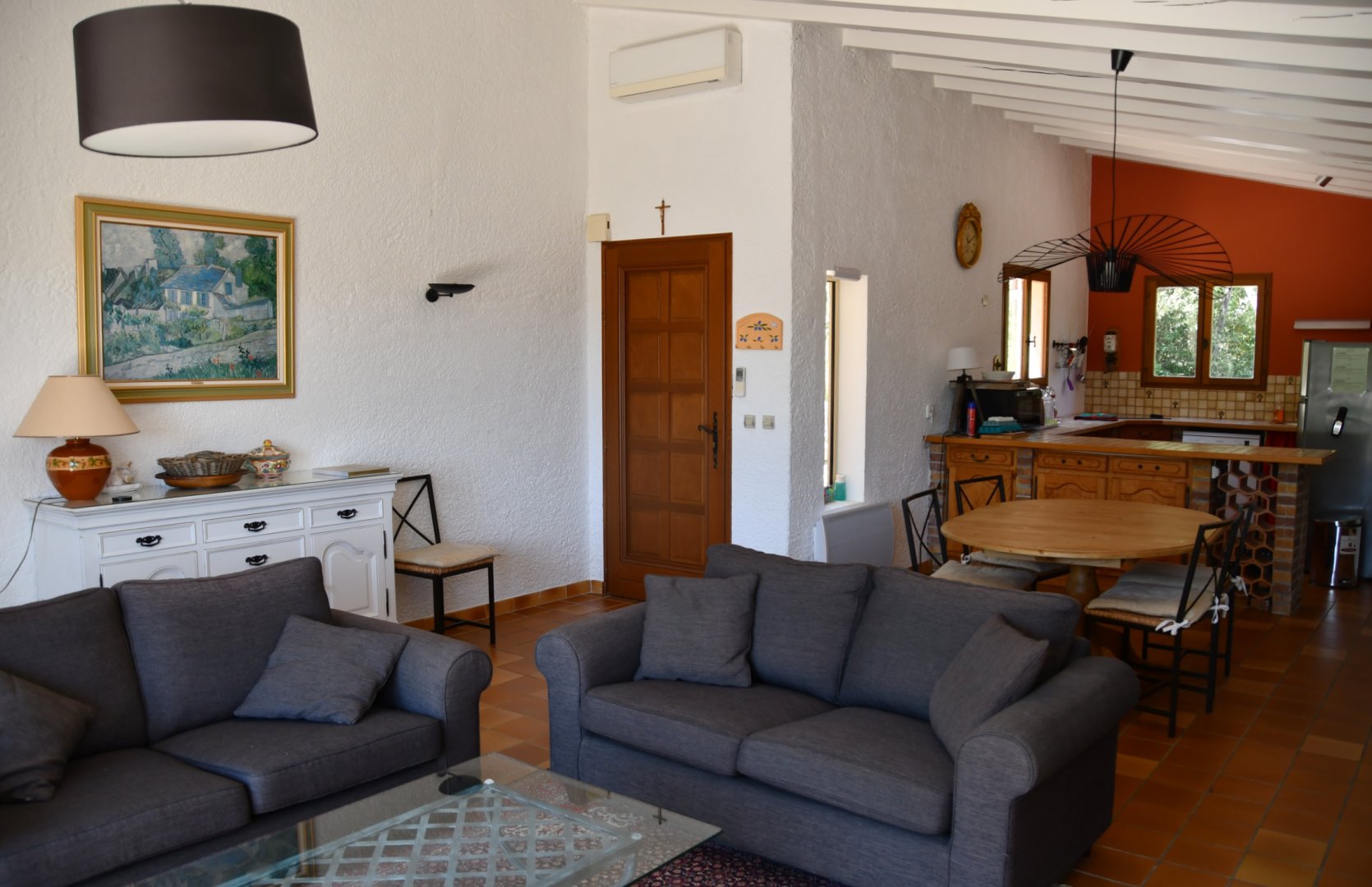 Le mas se trouve en contrebas du chemin, entrée dans le living-salon donnant sur une grande terrasse.