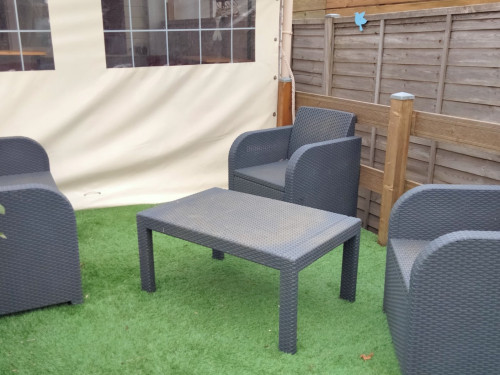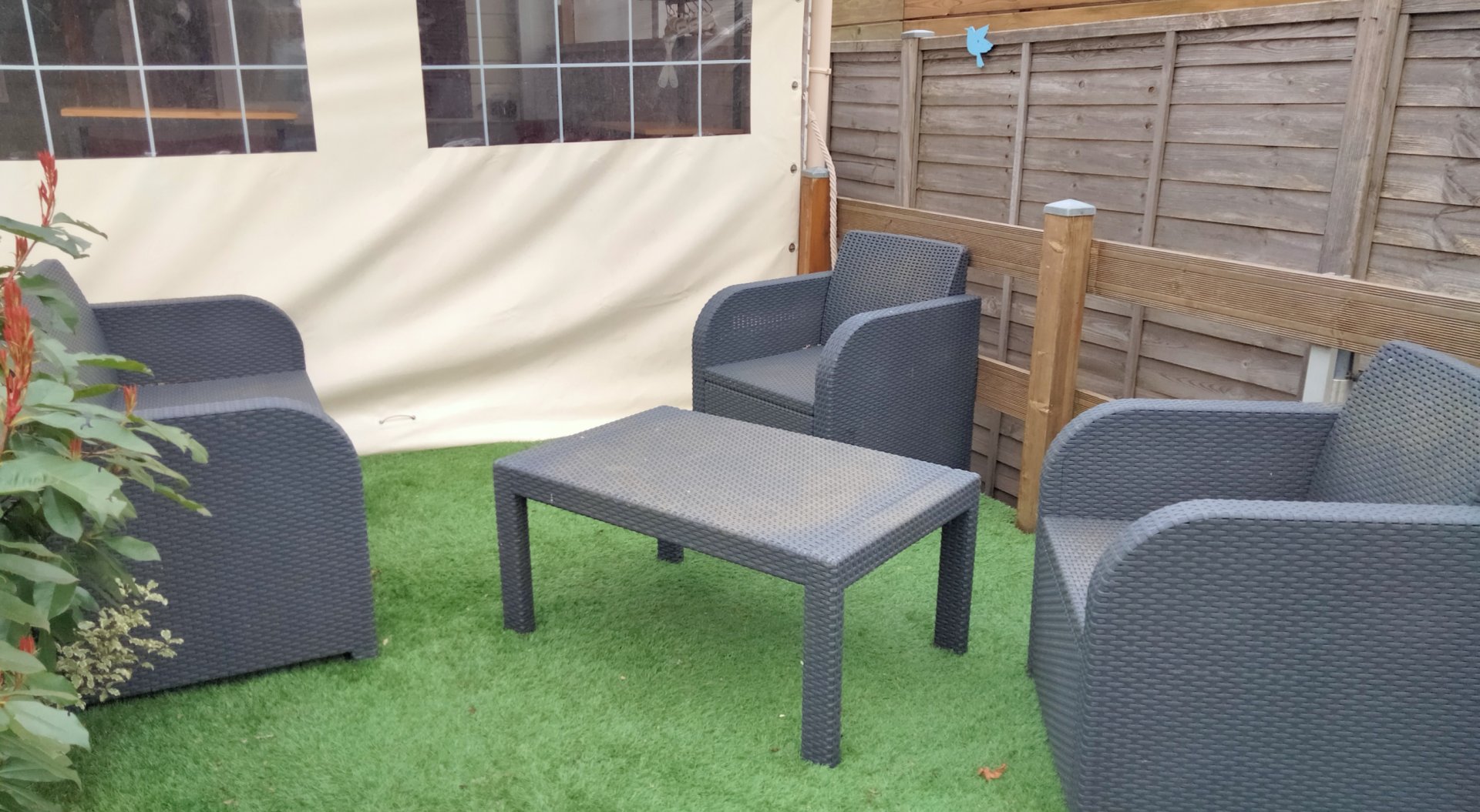 Le confort : clim., 2 chambres, jardinet clos, 2 cuisines dont une d'été sur la terrasse