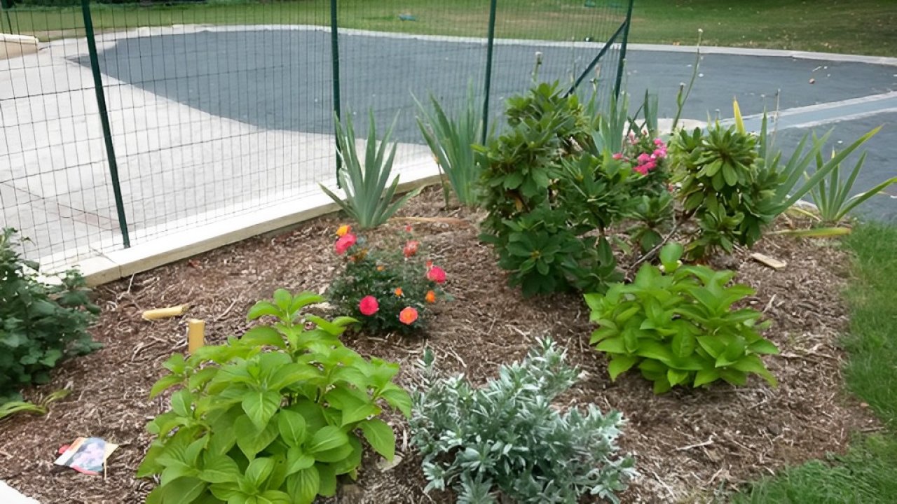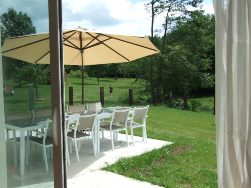 Extérieur très agréable avec 4 tables et chaises, parasol, barbecue, 4 transats.