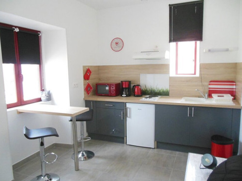 Cuisine équipée avec plaques à induction, hotte aspirante, réfrigérateur avec compartiment Congélateur, grille pain, cafetière électrique, bouilloire électrique, micro ondes, batterie de cuisine, ustensiles de cuisine.