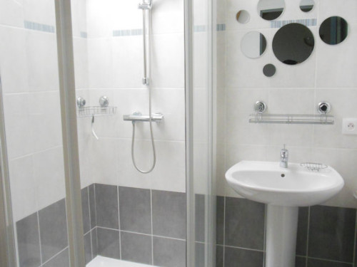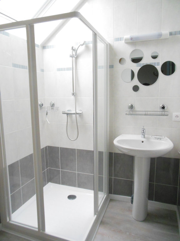 Une salle d'eau équipée avec cabine de douches de 80 cm x 80 cm, lavabo, WC, sèche serviettes électrique.