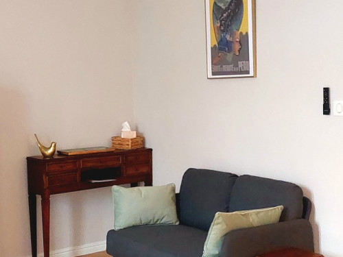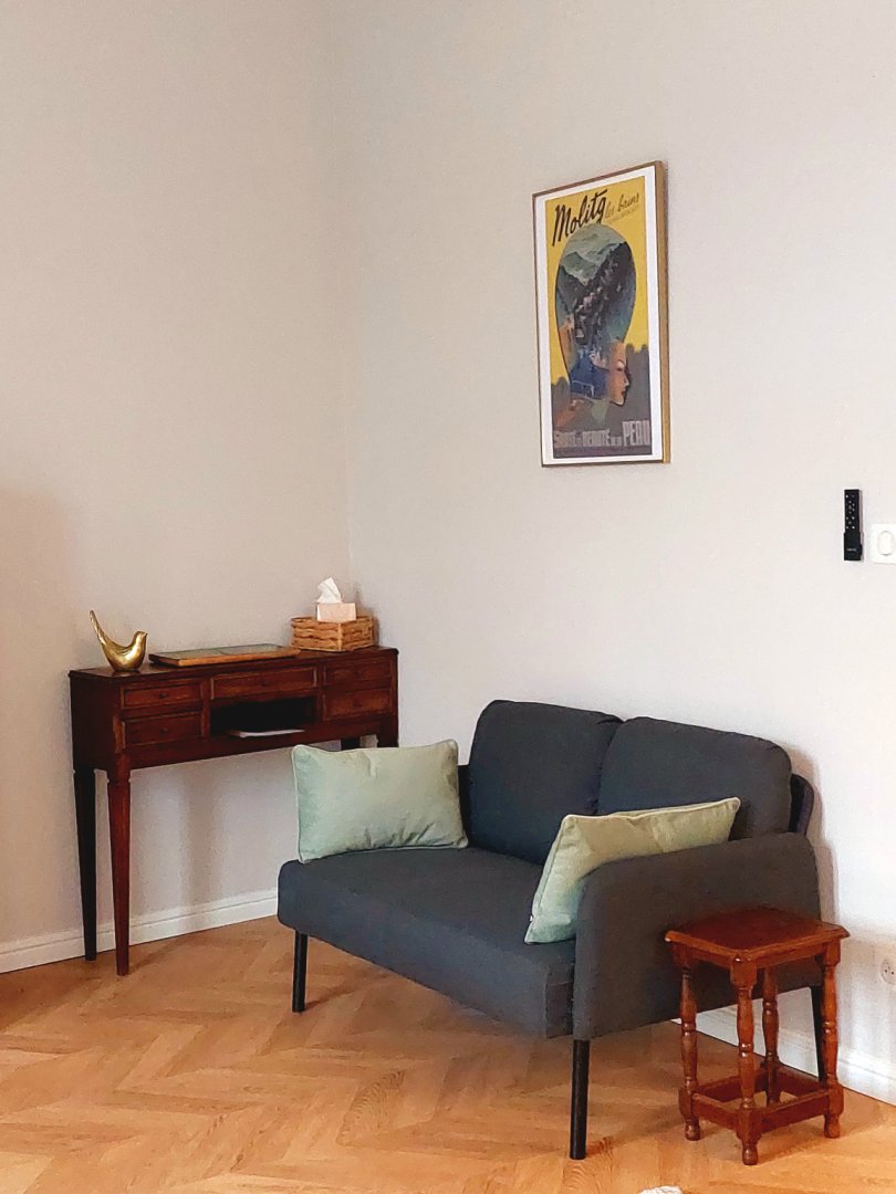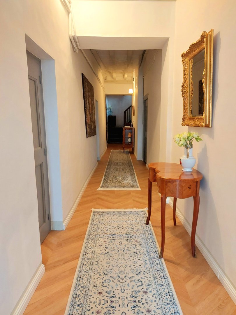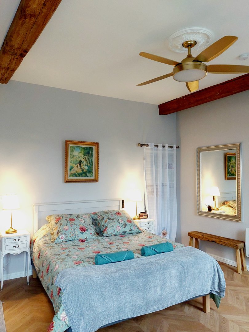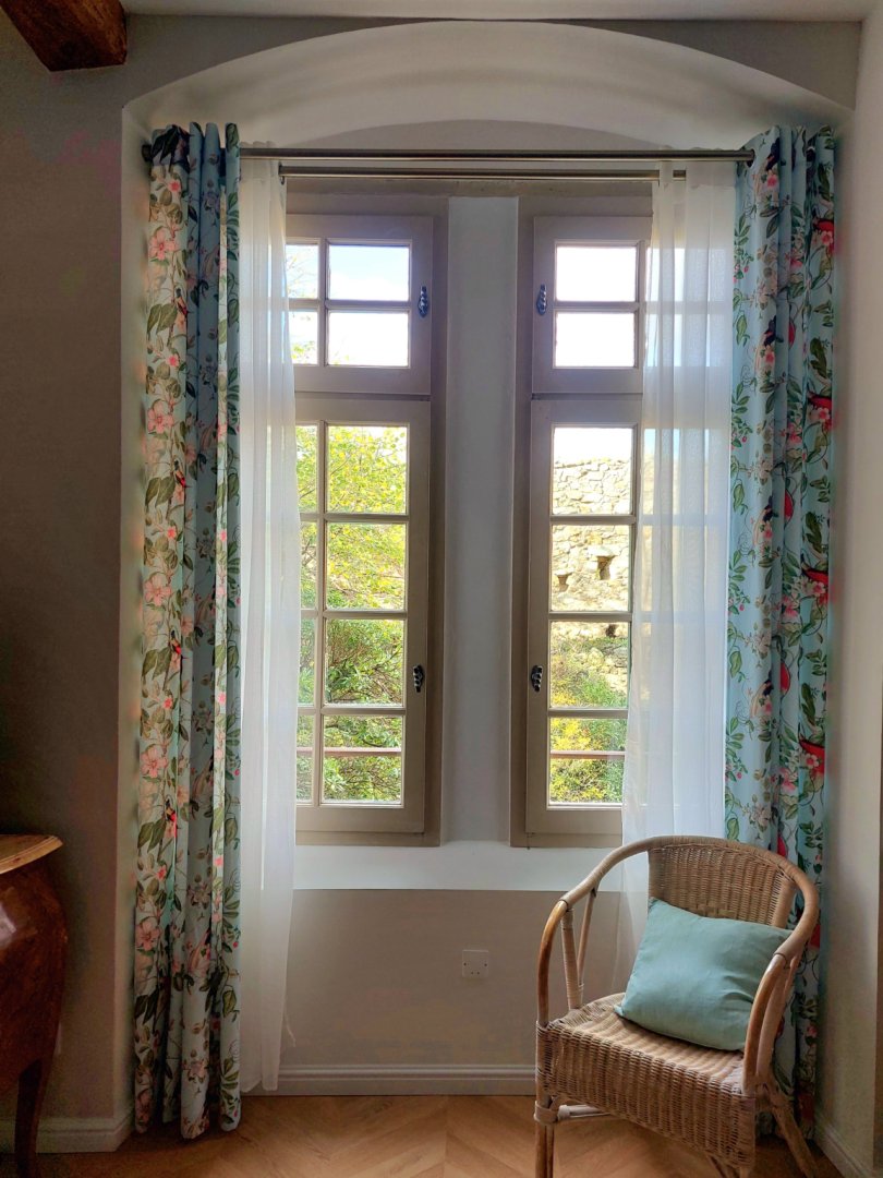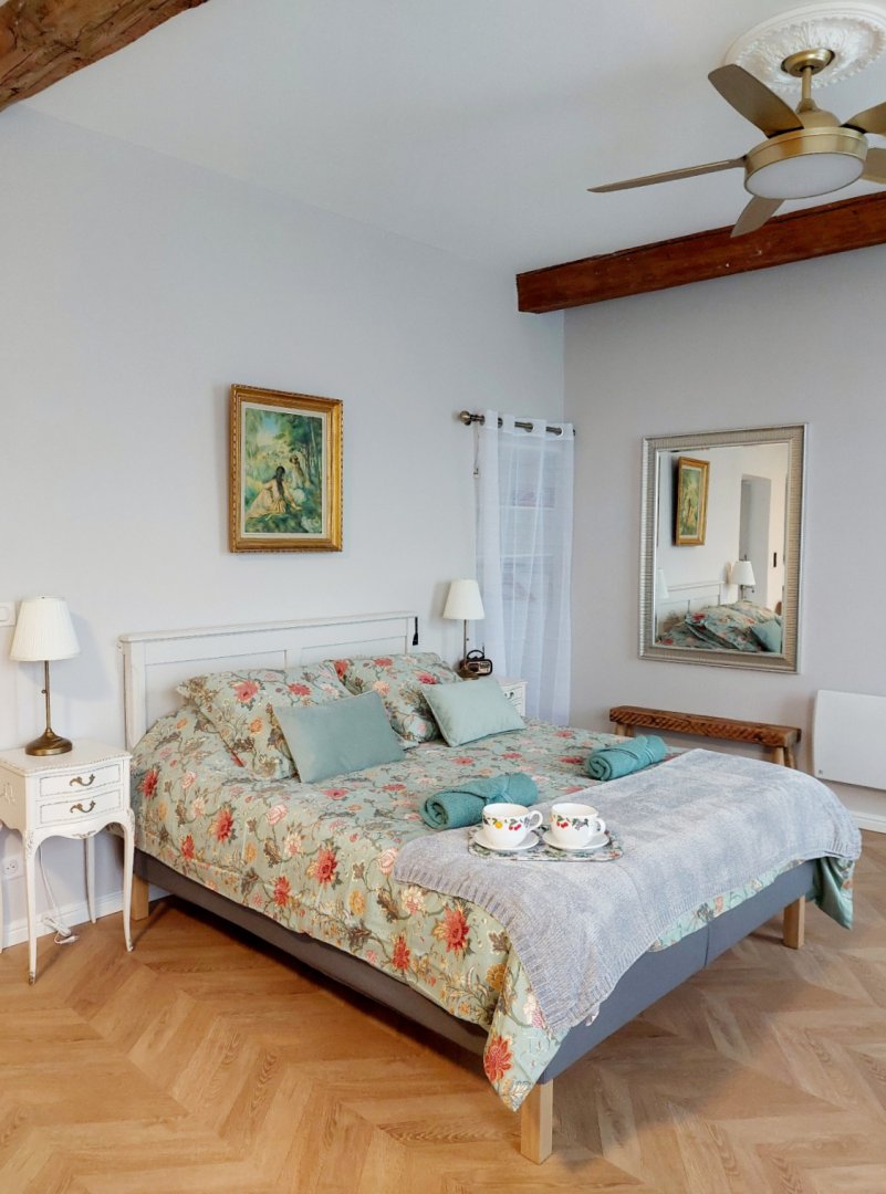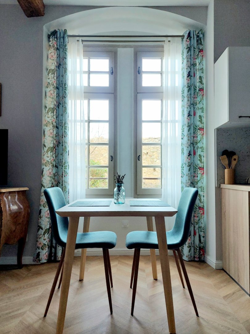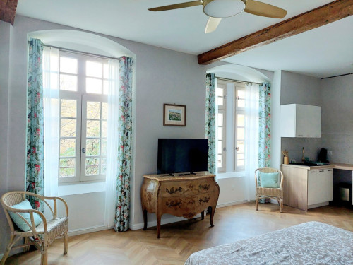 Baigné de lumière naturelle grâce à ses deux fenêtres cintrées orientées plein sud, ce studio offre une vue apaisante sur la cour intérieure et l’église du village.
