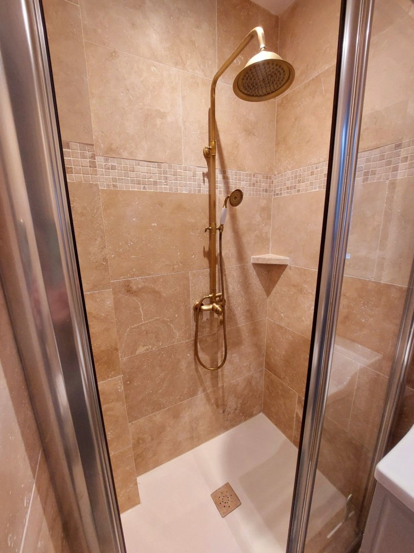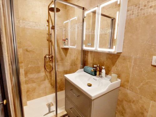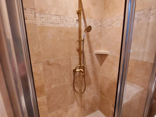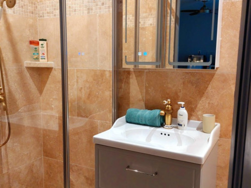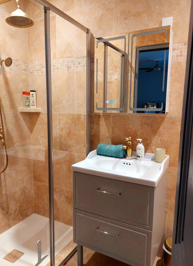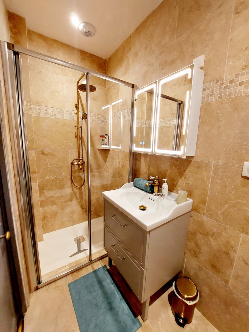 Salle de bains élégante avec douche, sèche-cheveux, et produits d’accueil écologiques