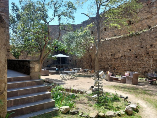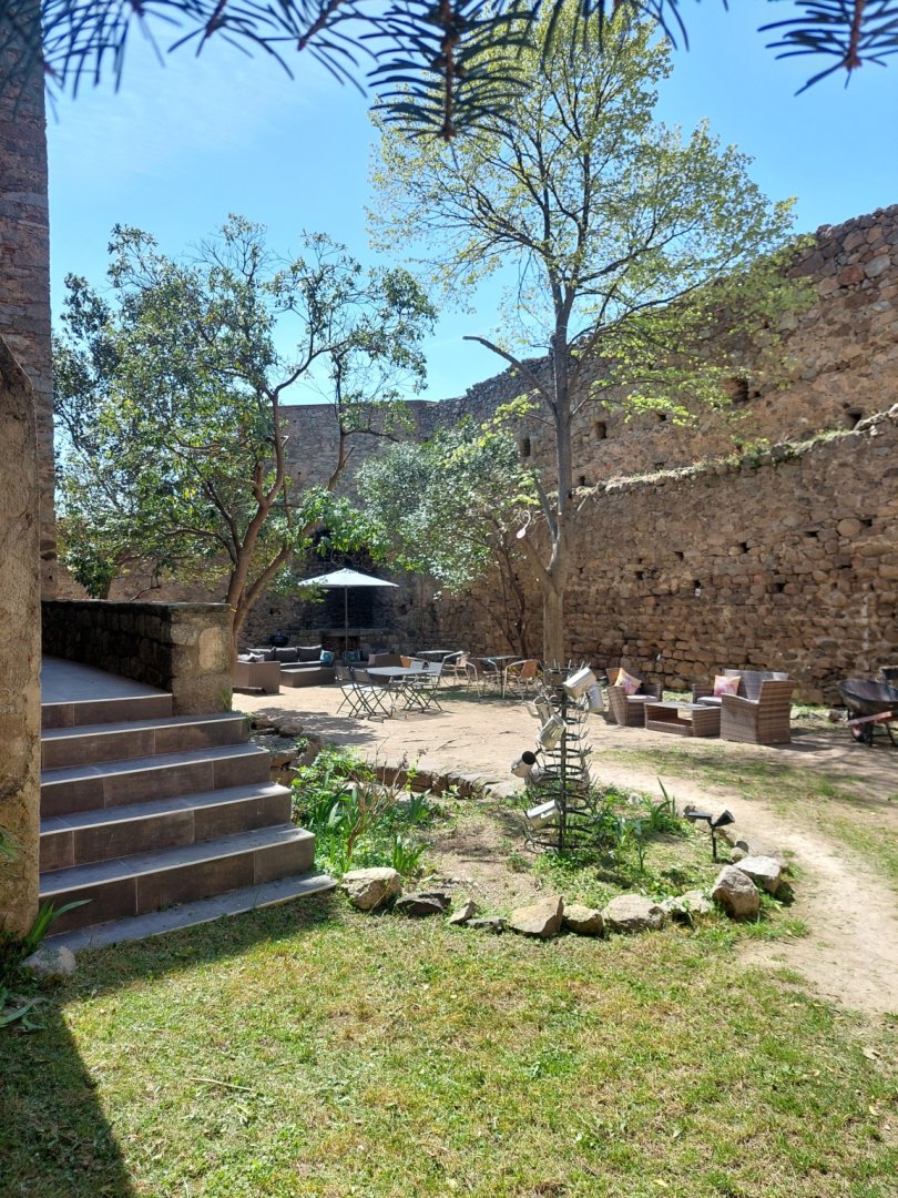 Accès à la cour intérieure et au jardin arboré, au sein des remparts historiques du château