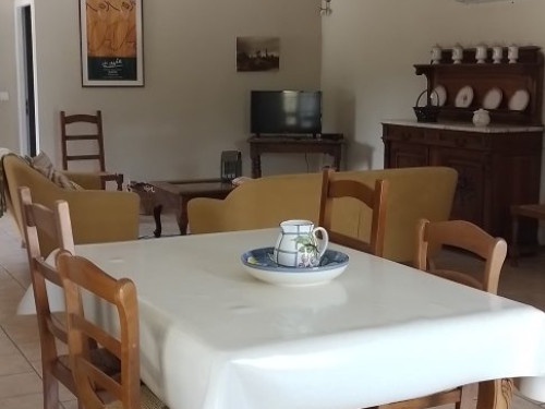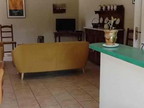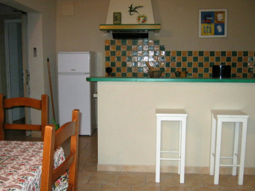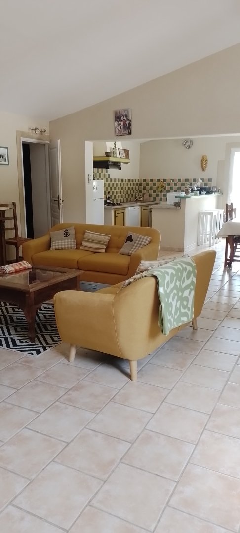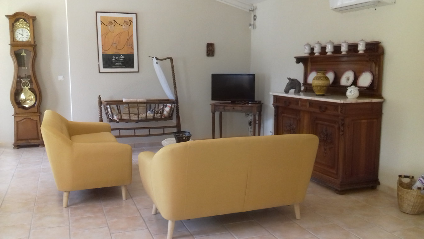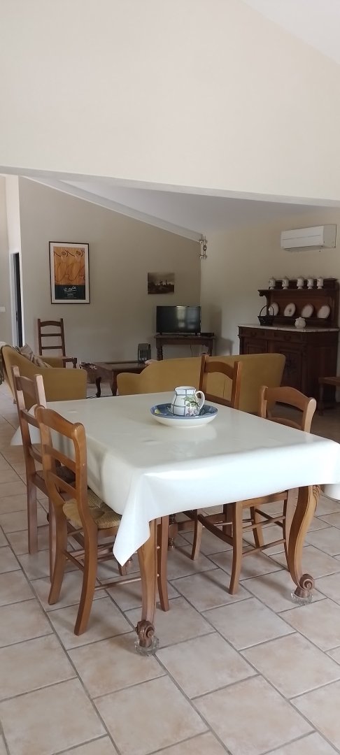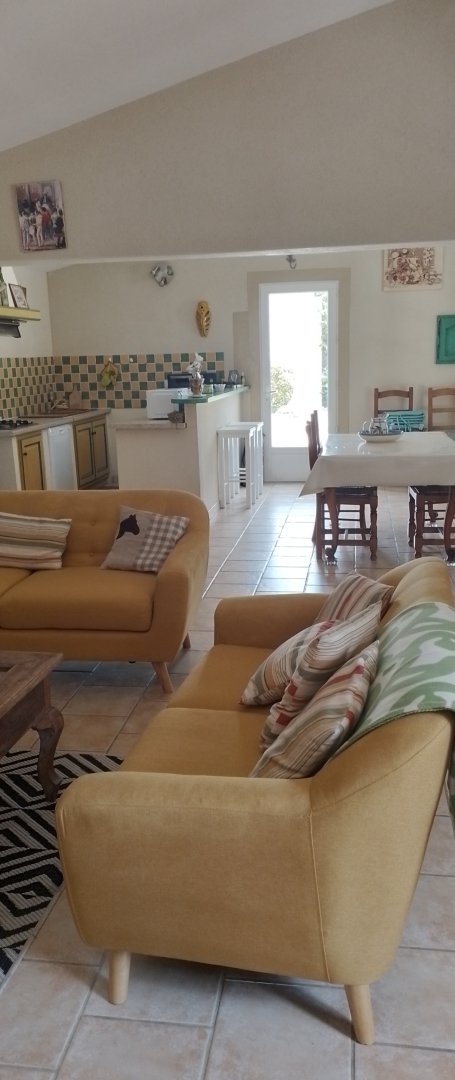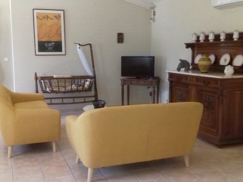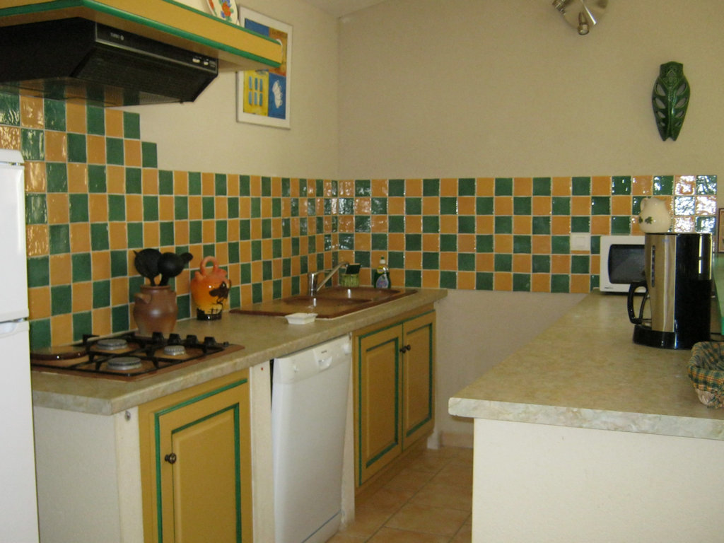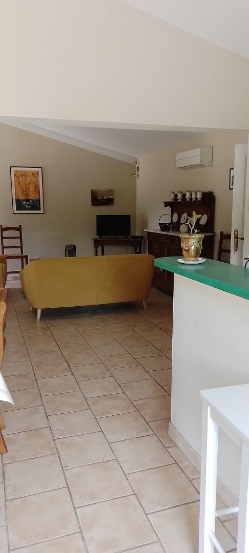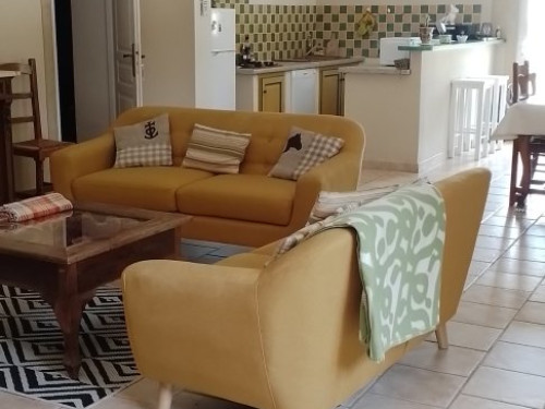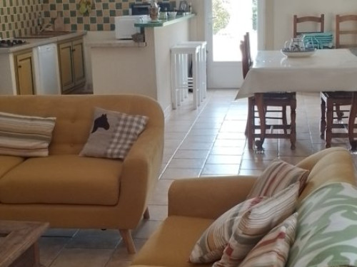 - un salon climatisé avec télévision et cuisine américaine toute aménagée (frigidaire, micro-ondes, four, toaster, presse agrume, lave vaisselle, gazinière)