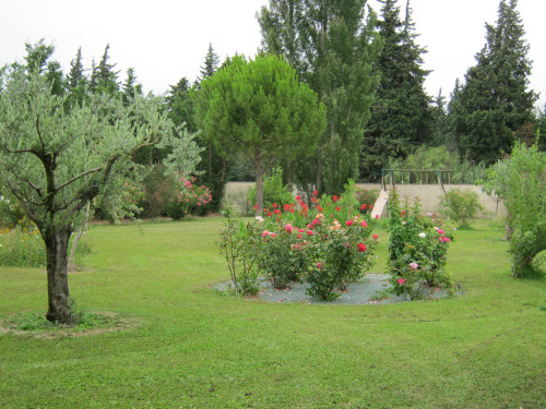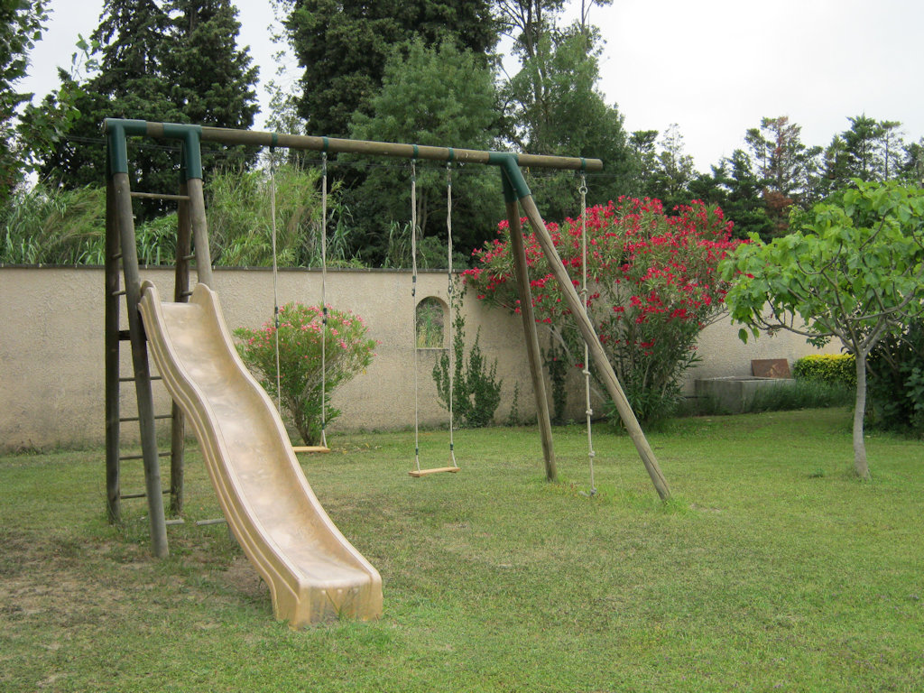 Un grand jardin arboré et fleuri avec un portique pour les plus jeunes enfants