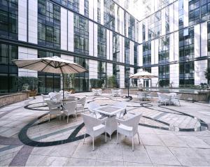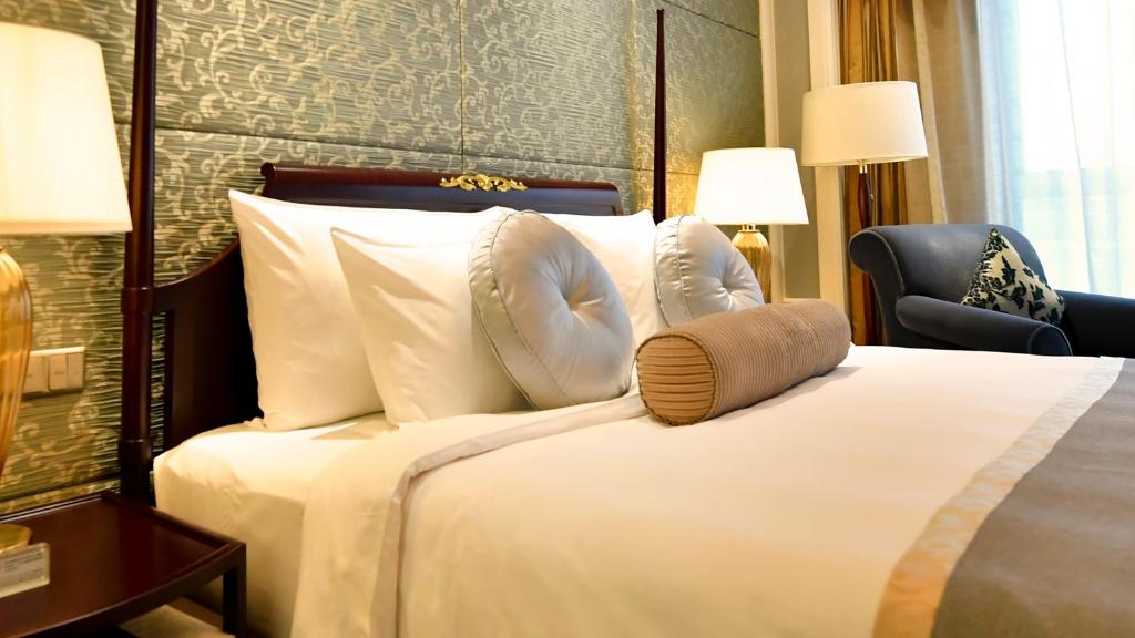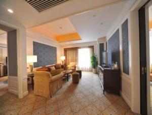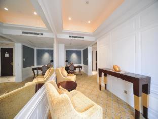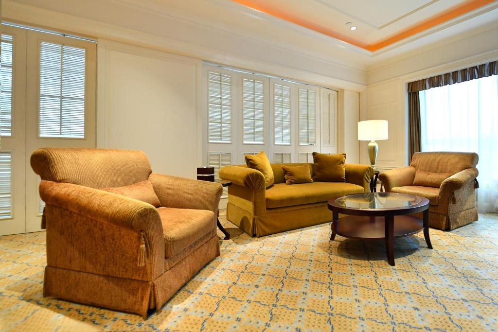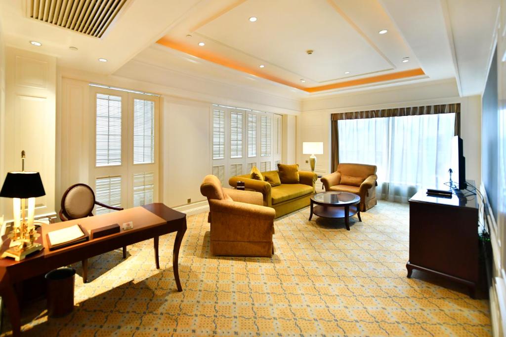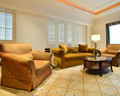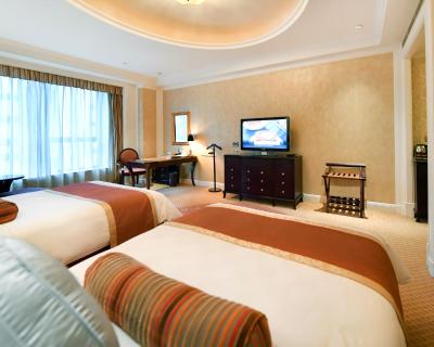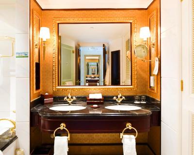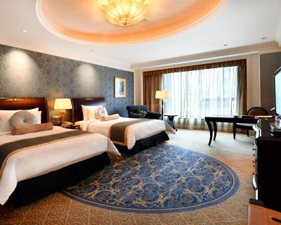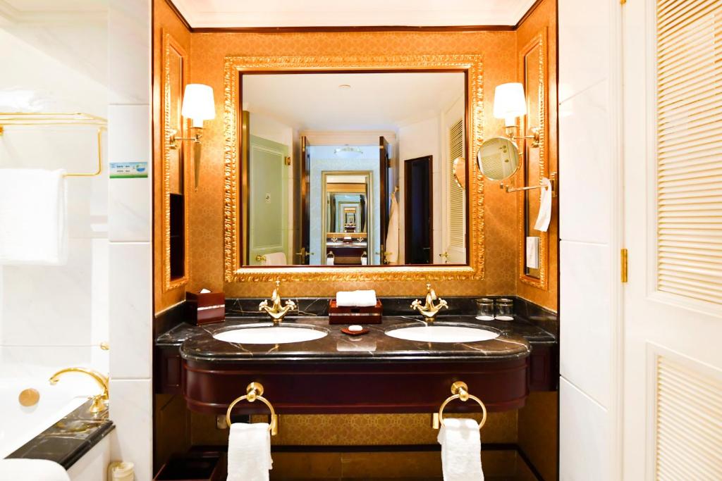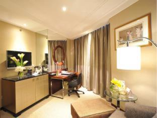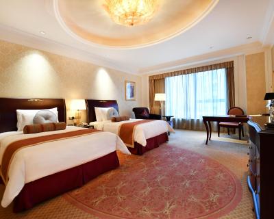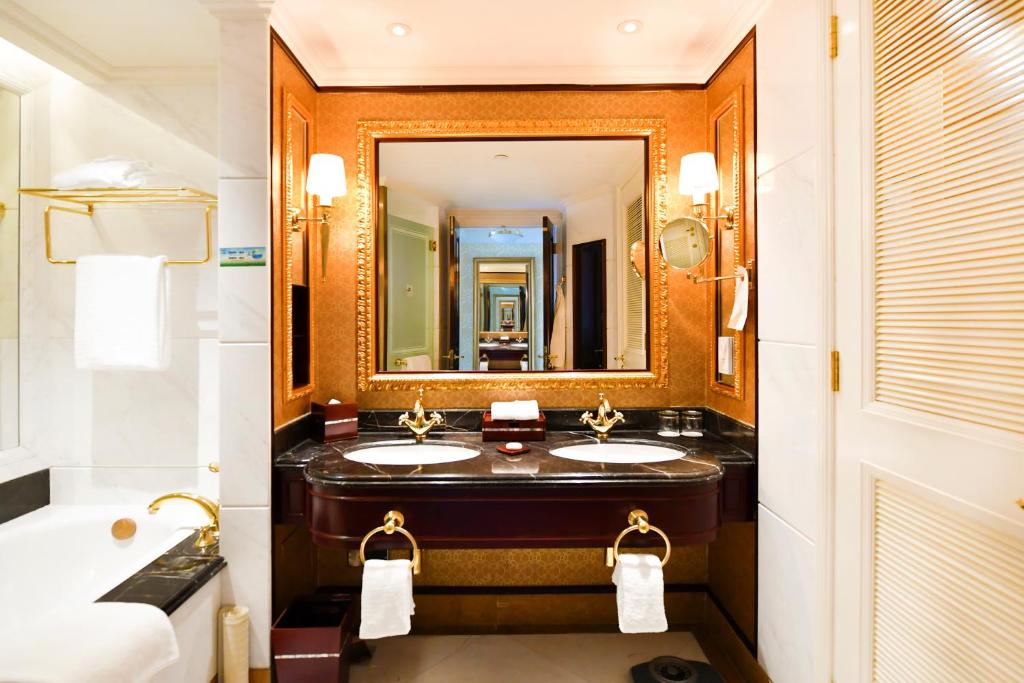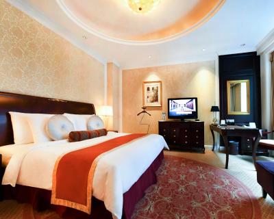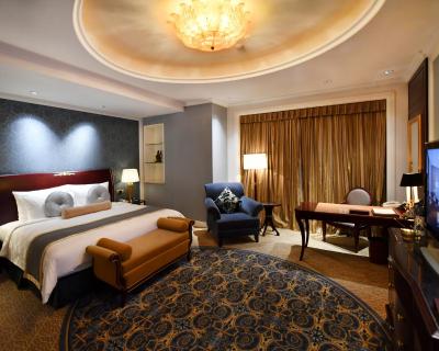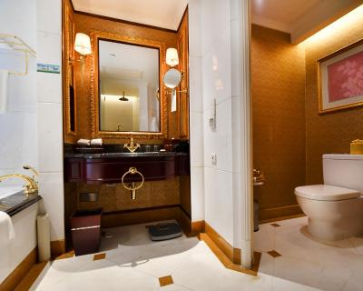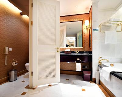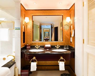 Élégamment décorées dans des teintes brunes et dorées, les chambres comprennent une télévision à écran plat, un bureau, un coffre-fort personnel, ainsi qu’une salle de bains spacieuse en marbre.