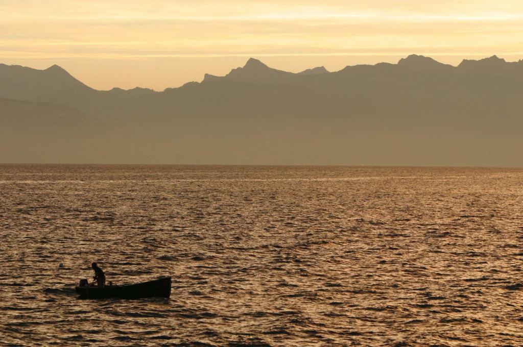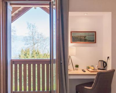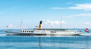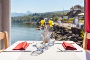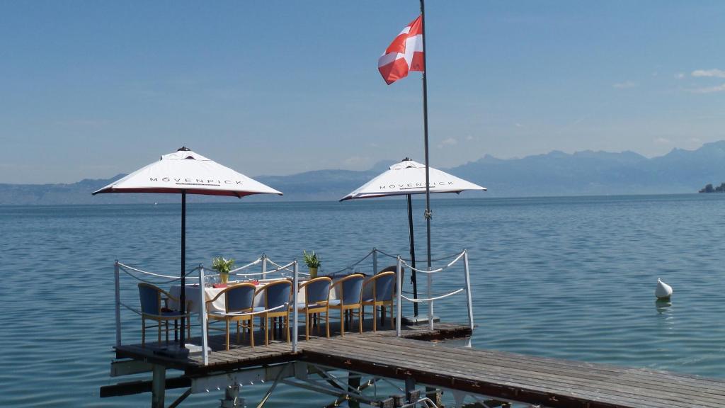 Le restaurant gastronomique « Le Radeau d'Alexis » est doté de grandes fenêtres donnant sur le lac Léman.
