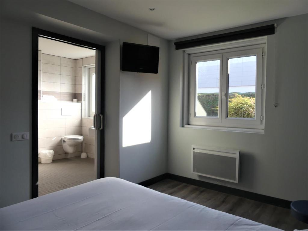 Les chambres de l'Ibis budget Brest Sud Plougastel - Hôtel rénové disposent d'une salle de bains privative avec douche et toilettes. Elles comprennent également un bureau.