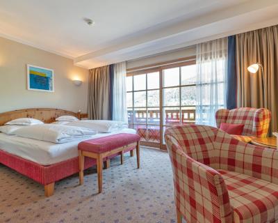 The Kaiserhof’s rooms are furnished in a traditional Tyrolean style. They feature a flat-screen cable TV, a work desk, and a bathroom with bathrobes and hairdryer.