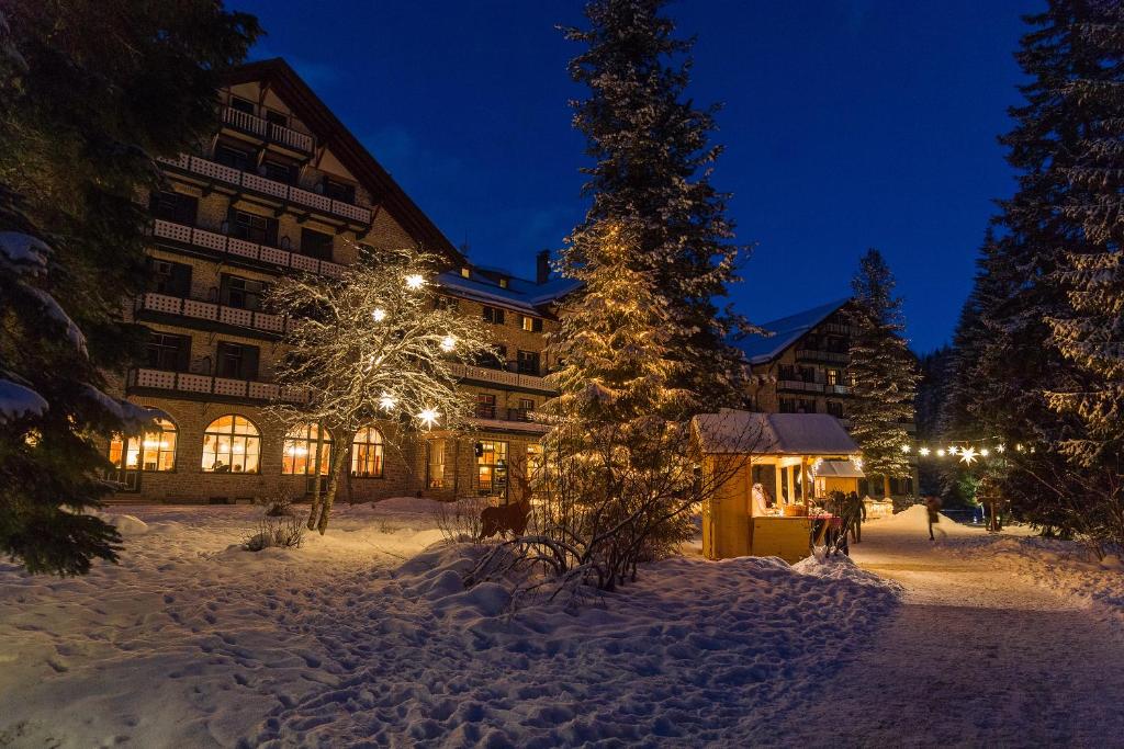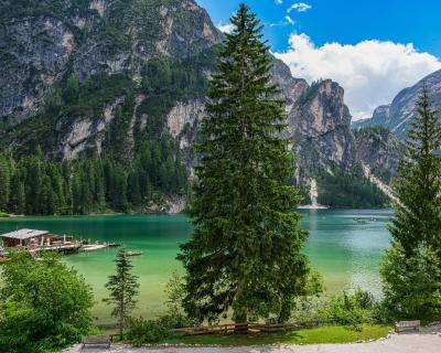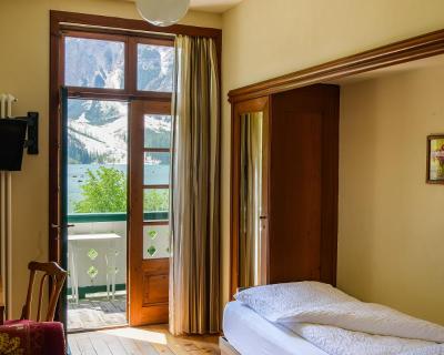 Rooms have balconies overlooking Lake Braies and the surrounding mountains.