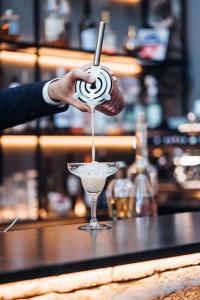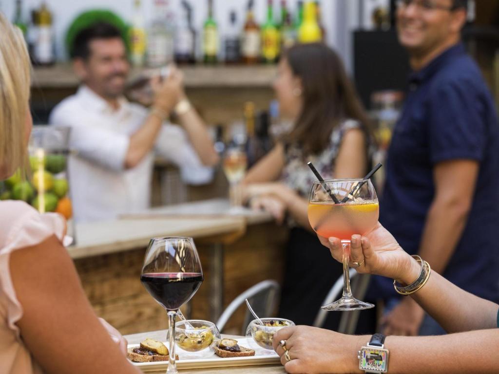 The restaurant offers Mediterranean cuisine with local and seasonal products. Breakfast is served each morning in a designated breakfast room under a glass roof.