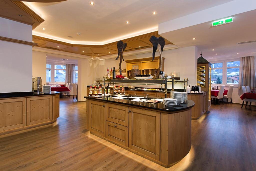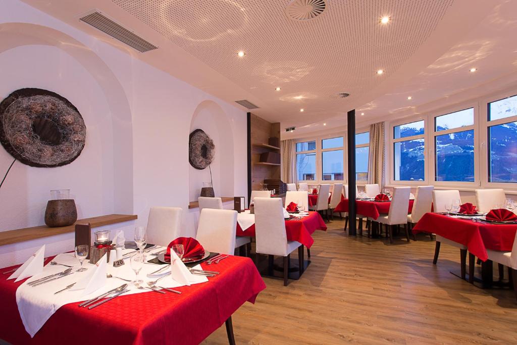 Le restaurant de l'Hotel Sonnleiten sert une cuisine tyrolienne et internationale raffinée, accompagnée d'une sélection de vins de sa propre cave. Il dispose d'un jardin d'hiver et d'une terrasse offrant une vue panoramique sur le plateau Serfaus-Fiss-Ladis.