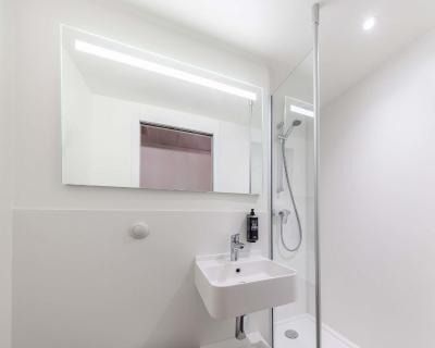 Les chambres de l’ibis budget Perpignan Centre Rénové en 2025 - Hôtel Economique au Centre ville de Perpignan comportent une salle de bains privative avec une douche.