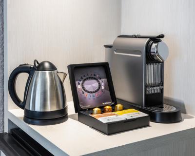 Cette chambre comprend également un minibar, une machine à café Nespresso, un peignoir et des chaussons.