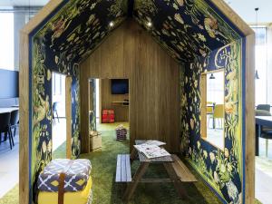 L’hôtel affiche une décoration alliant le style industriel avec des éléments typiquement hollandais et beaucoup de touches de vert. Le rez-de-chaussée comporte de nombreuses niches avec un mobilier confortable pour se détendre, mais également une cabane de jeux pour enfants, un coin iMac et un concierge virtuel.