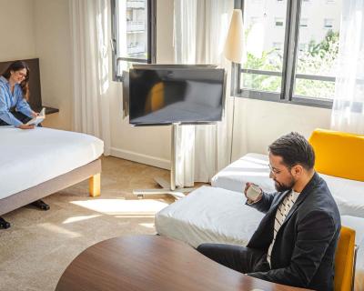 Situé à l'est de Paris, le Novotel Suites Paris Montreuil Vincennes est un établissement 4 étoiles. Il propose des suites bénéficiant d'une connexion Wi-Fi gratuite, ainsi que des chaînes Canal+ et BeIN Sport. Vous rejoindrez la station de métro Porte de Montreuil en 8 minutes à pied. Cette dernière dessert directement les Galeries Lafayette ou permet de rejoindre les lignes conduisant à Disneyland Paris et aux Champs-Élysées.