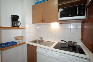 Les studios pour 4 personnes des appartements 2 pièces avec cabine pour 6 personnes du Hameau du Borsat disposent d'une kitchenette complète avec four micro-ondes et lave-vaisselle (sauf en studio).