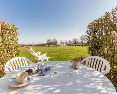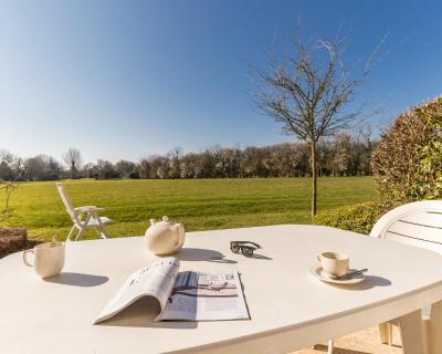 La résidence s'intègre harmonieusement dans le paysage normand avec ses façades en pierre et plâtre, ses toits en ardoise et ses volets en bois.