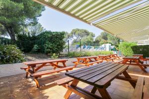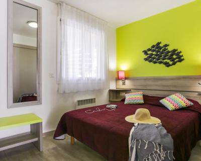Tous les hébergements sont situés au 1er ou au 2ème étage. Le petit balcon du 2ème étage peut accueillir 2 personnes et le grand balcon du 1er étage peut accueillir 4 personnes. Le balcon est situé côté route. Tous les balcons possèdent un auvent électrique.