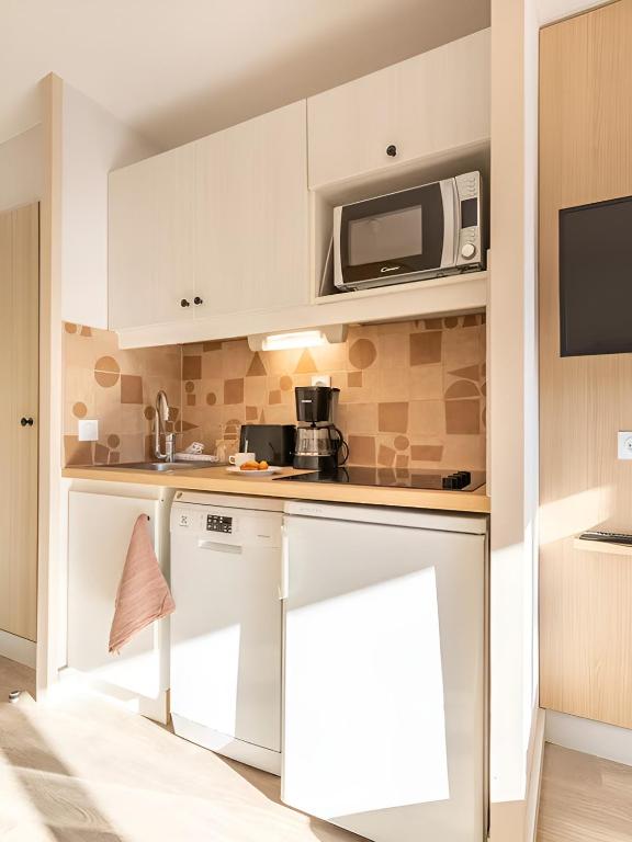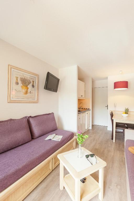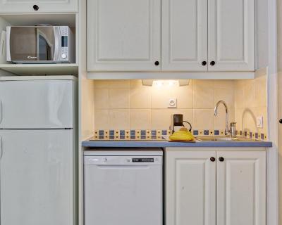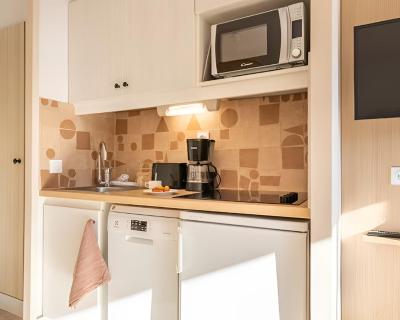 La kitchenette entièrement équipée s’ouvre sur la pièce à vivre. Cet appartement offre une vue sur la pinède ou la piscine.