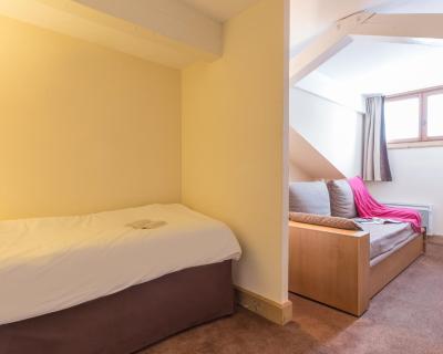 L'appartement en duplex se compose d'un salon avec 2 canapés-lits, d'une chambre avec 1 lit double et d'une alcôve avec 2 lits simples sans fenêtre. Il peut bénéficier d'un emplacement privilégié (sous réserve de disponibilité).