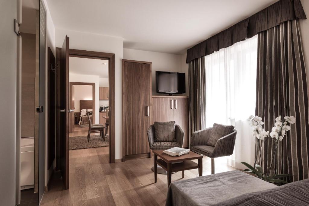 Revêtues de parquet, les chambres disposent d'un balcon, d'une télévision à écran plat, d'un minibar et d'articles de toilette offerts. Certaines chambres disposent d'un mobilier traditionnel de style alpin, tandis que d'autres présentent une atmosphère plus design.