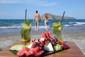 Le restaurant principal sert une cuisine raffinée à la carte. Le snack-bar prépare quant à lui des repas plus légers et la taverne de la plage, des mezzes grecs. Des repas privés peuvent être organisés sur la plage.
