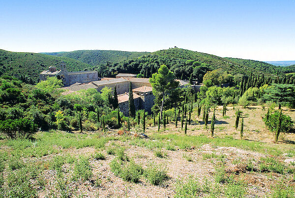 Au sud-ouest de Narbonne, c’est dans un vallon rocailleux des Corbières que se cache ce somptueux ensemble cistercien, en fond de vallée. L’abbaye est nichée au cœur d’un paysage typiquement méditerranéen où dominent le cyprès, le pin et le buis.