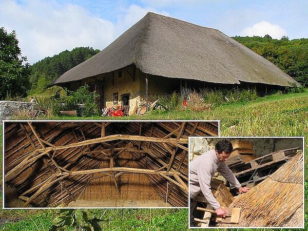 L’ensemble est surmonté d’un toit imposant, entièrement couvert de chaume.