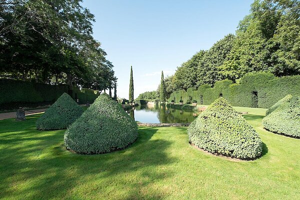 Dans le prolongement du manoir, les jardins s'étendent pour ainsi dire à perte de vue... la perspective parfaite accentue cette sensation de profondeur renforcée par une excellente maîtrise de l'art topiaire.