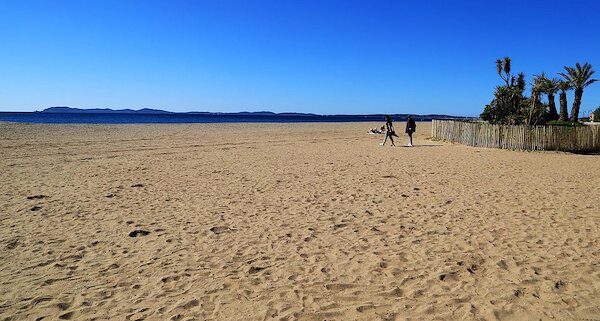 Belle et grande plage en face des iles d Hyères et du Fort de Brégençon, expo est.