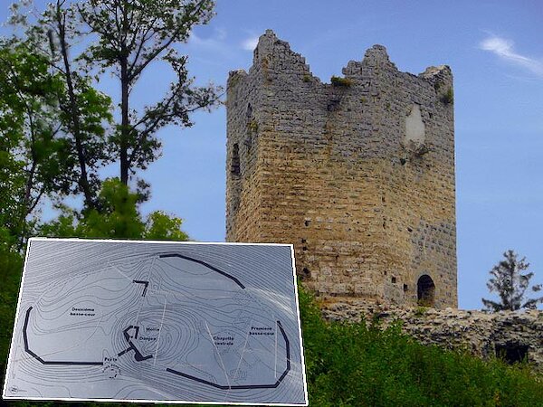 Le château était construit avec une triple enceinte et avait un donjon a la particularité peu courante d'être pentagonal irrégulier.