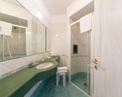 Récemment rénovées, les salles de bains privatives sont pourvues d'une douche, d'un sèche-cheveux et d'articles de toilette gratuits à base d’eau thermale d’Ischia.