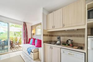 La salle de bains privative est pourvue d’une baignoire ou d’une douche. La kitchenette entièrement équipée s’ouvre sur la pièce à vivre.